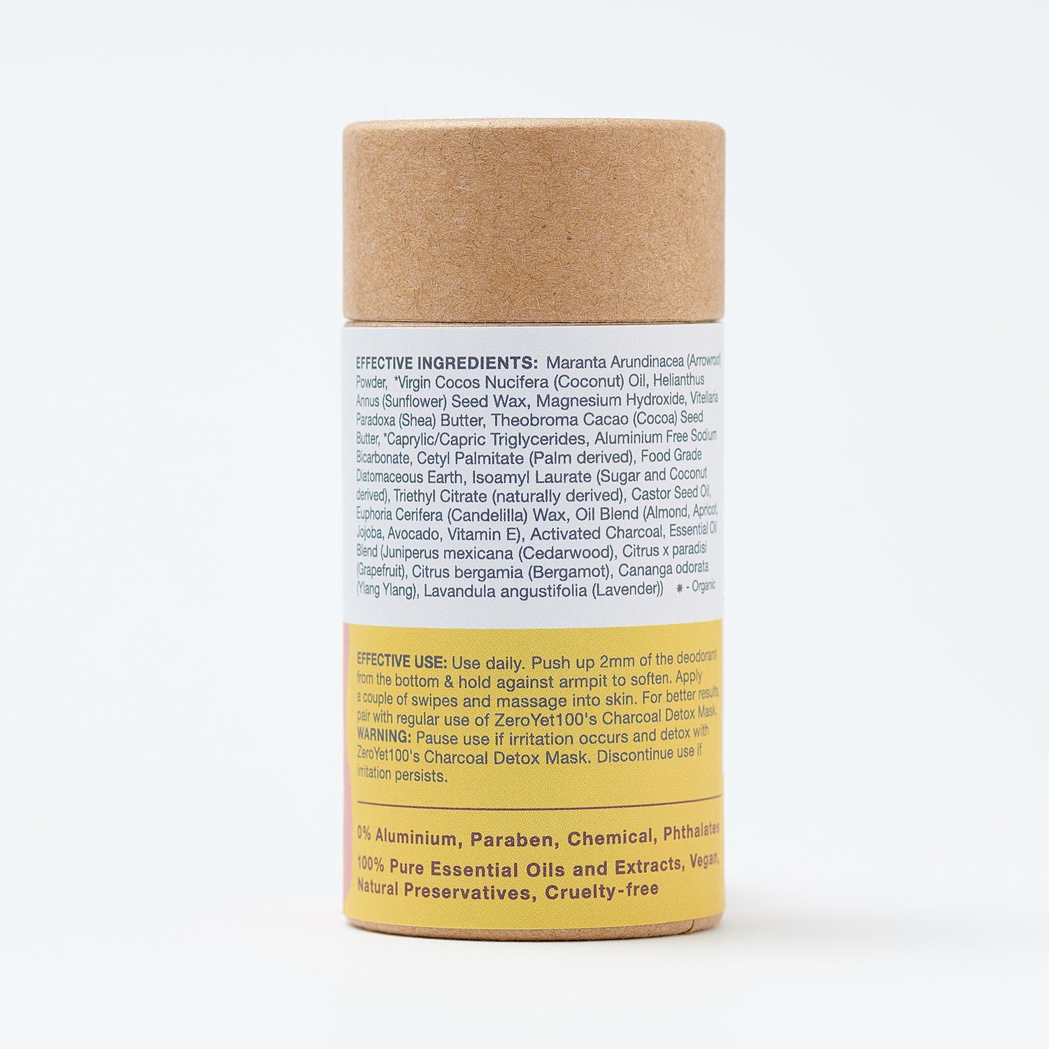 Maranta Arundinacea (Arrowroot) Powder, *Virgin Cocos Nucifera (Coconut) Oil, Helianthus Annus (Sunflower) Seed Wax, Magnesium Hydroxide, Vitellaria Paradoxa (Shea) Butter, Theobroma Cacao (Cocoa) Seed Butter, *Caprylic/Capric Triglycerides, Aluminium Free Sodium Bicarbonate, Cetyl Palmitate (Palm derived), Food Grade Diatomaceous Earth, Isoamyl Laurate (Sugar and Coconut derived), Triethyl Citrate (naturally derived), Castor Seed Oil, Euphoria Cerifera (Candelilla) Wax, Oil Blend (Almond, Apricot, Jojoba, Avocado, Vitamin E), Activated Charcoal