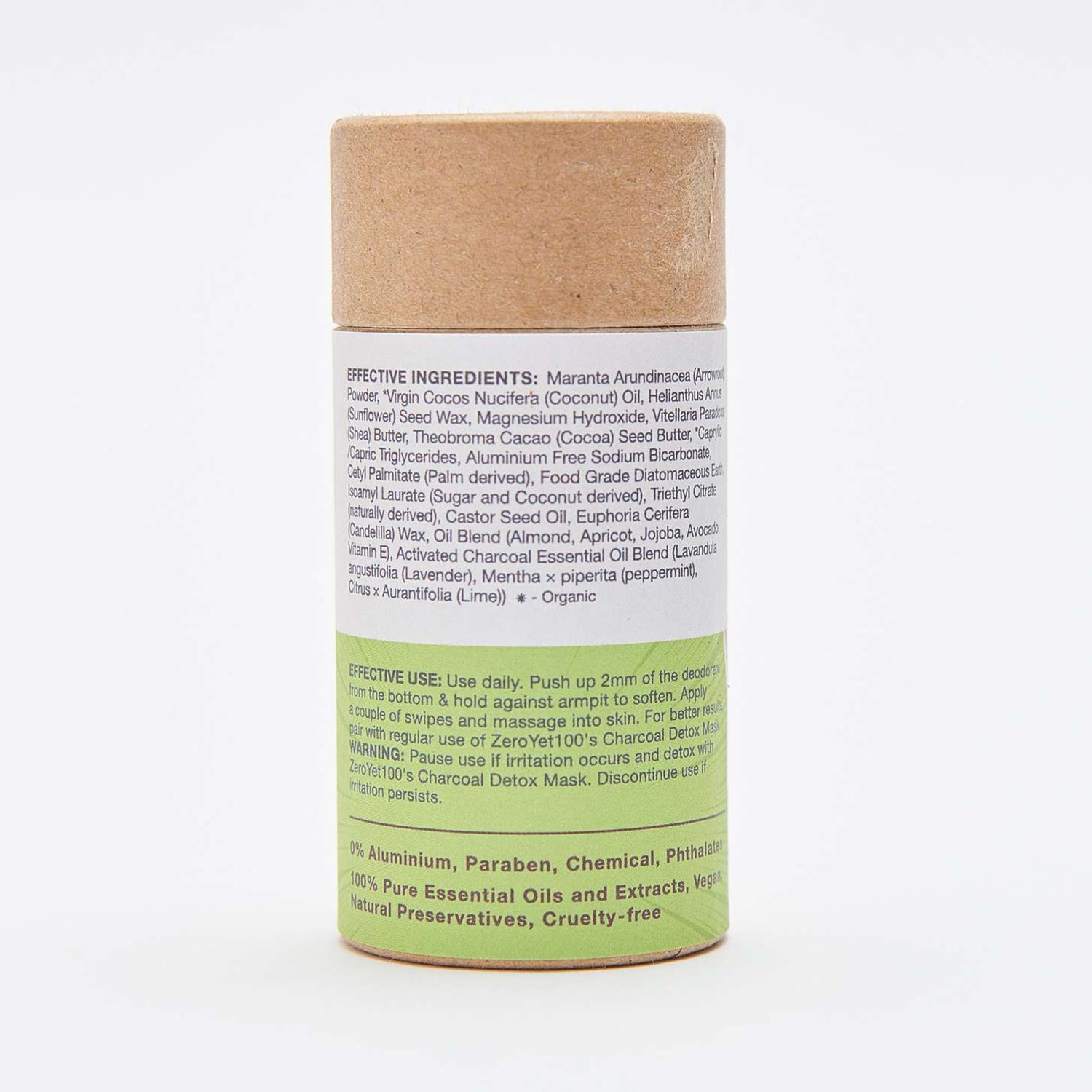 Maranta Arundinacea (Arrowroot) Powder, *Virgin Cocos Nucifera (Coconut) Oil, Helianthus Annus (Sunflower) Seed Wax, Magnesium Hydroxide, Vitellaria Paradoxa (Shea) Butter, Theobroma Cacao (Cocoa) Seed Butter, *Caprylic/Capric Triglycerides, Aluminium Free Sodium Bicarbonate, Cetyl Palmitate (Palm derived), Food Grade Diatomaceous Earth, Isoamyl Laurate (Sugar and Coconut derived), Triethyl Citrate (naturally derived), Castor Seed Oil, Euphoria Cerifera (Candelilla) Wax, Oil Blend (Almond, Apricot, Jojoba, Avocado, Vitamin E), Activated Charcoal